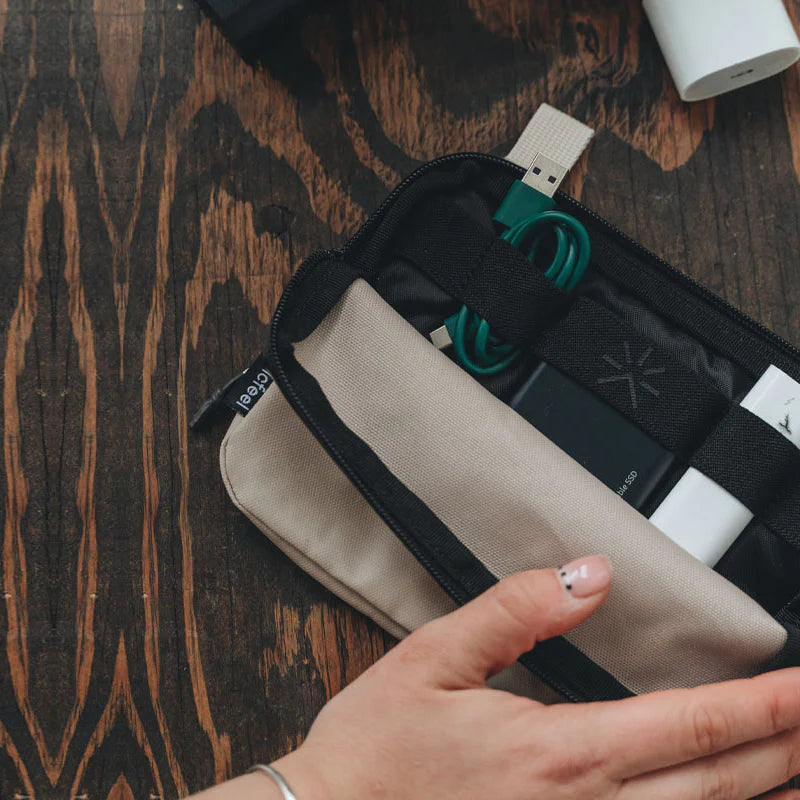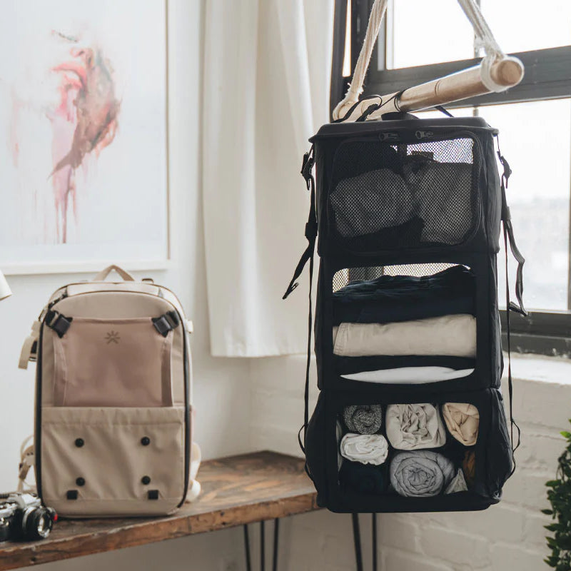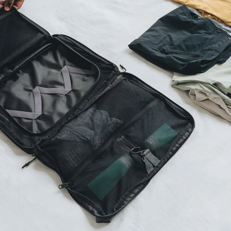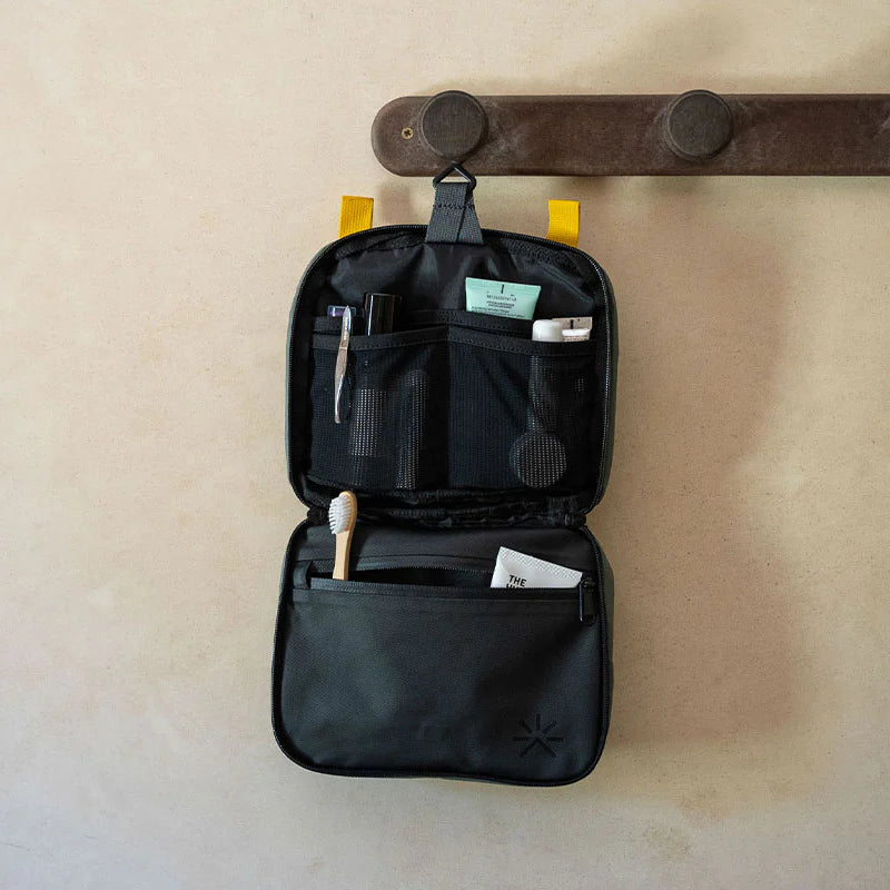 A hanging toiletry with FidLock® magentic attachments for easy accessibility.